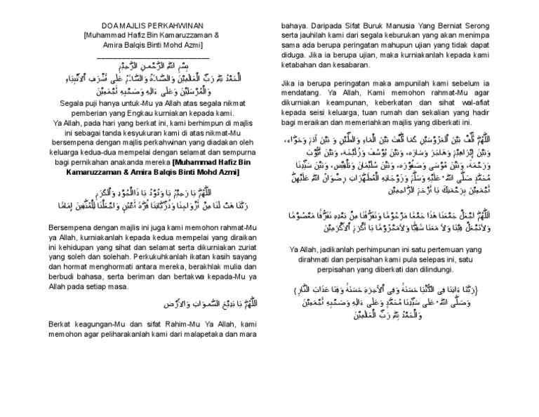 Doa Kesyukuran Dan Selamat : 1 : Bantuan ejaan rumi turut disertakan bagi membantu mereka yang sukar membaca jawi.. 14) bacaan doa majlis perasmian. 9) bacaan doa majlis perkahwinan. Berdoa untuk keselamatan dalam dunia maupun dan akhirat serta meminta pertolongan atau syafa at semuanya adalah hanya dengan allah tidak ada satupun yang dapat menolak karena semua yang ada di alam semesta ini berjalan atas kehendak nya. Semoga perkongsian bacaan doa majlis rasmi dan tidak rasmi boleh dijadikan rujukan berguna. Doa selamat ini boleh dibaca pada majlis kesyukuran atau sebelum memulakan sesuatu program.